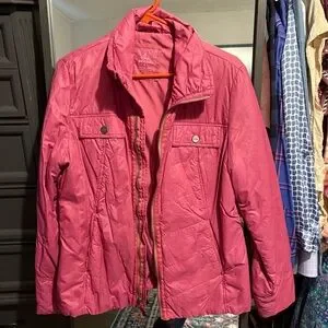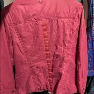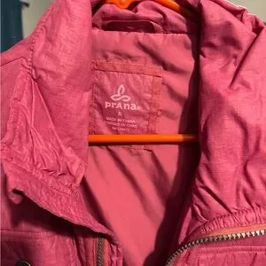 Stylish Prana jacket. Features a vibrant pinkish red color. Front pockets with button closure. Full zip front. Ideal for cool weather.