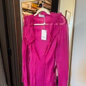 Stunning fuchsia maxi dress by Rat & Boa. Sheer fabric with long sleeves. Features a deep V-neck and side slit.
