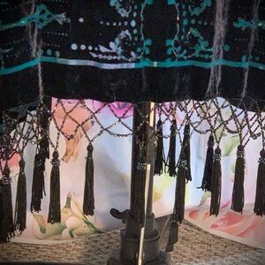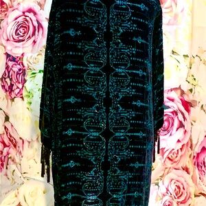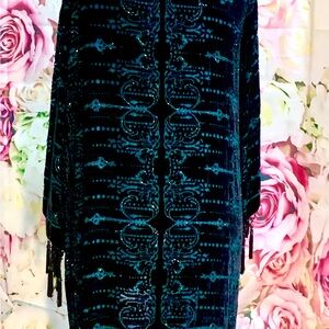 This elegant women's kimono sweater features a stunning black and blue design and sparkling beaded details and fringe. Its perfect to wear over a dress to formal evening events. I think it would be beautiful over a black or dark blue dress for a wedding guest or with a prom dress. Some of its beads have come off over the years but most of the beads are still attached.