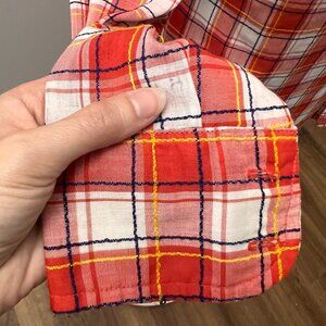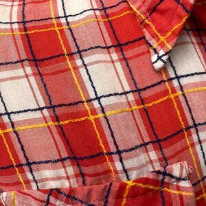 Oh for the love of vintage! This is a fabulous shirt that looks even better in person. It is a lightweight button down with a red plaid pattern that has raised threads of blue and yellow in the pattern. This gives it a really nice visual interest and texture. Classic pointed collar and button front pockets. This shirt just screams to be rocked with a good fitting pair of jeans. The tag on this dates it to likely the 70's but possibly as early as the late 60's.