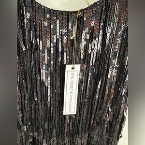 Stunning sequin dress with fringe details. Perfect for parties and special occasions. Eye-catching design with a glamorous touch.