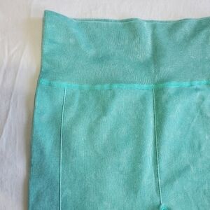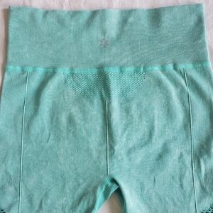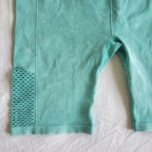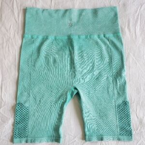 Size L/XL active shorts, mint green color with fun cutouts on the outer thigh and detail on back under waistband, ribbed fabric