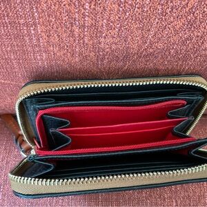 This Dooney & Bourke wallet showcases a sophisticated black and tan color scheme crafted from textured leather-like material. Its compact rectangular shape is perfect for holding essentials, while the gold-toned accents add a touch of elegance.