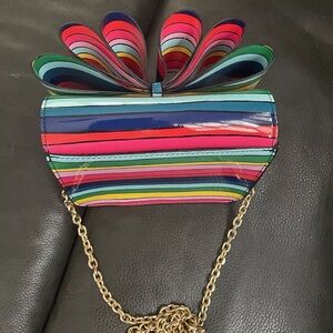 This Betsey Johnson shoulder bag features a striking bow detail made from a vibrant striped material, adding a playful touch to its design. The bag is complemented by gold hardware and a chic gold chain strap, making it a stylish accessory for any occasion.