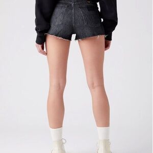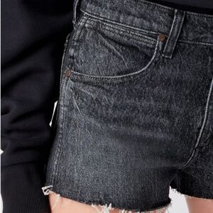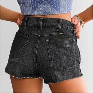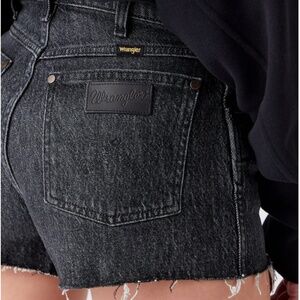 These Wrangler Jean shorts in size W32 are in great condition. The faded black washed denim fabric and frayed hem are combined to perfection for all of your warm weather festivities this season! The zipper is fully functional.