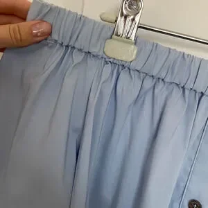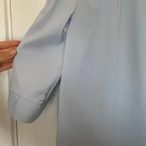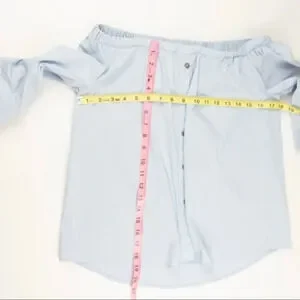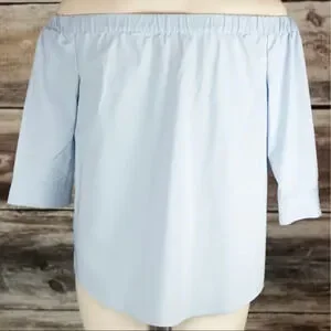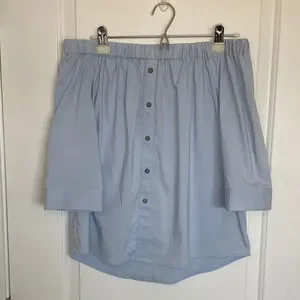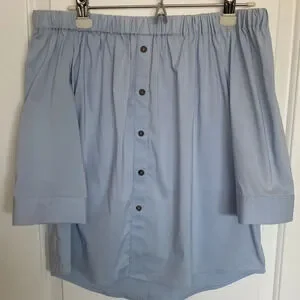 Vince Camuto women’s size XS light blue blouse. Off the shoulder style with elastic at the neck. Faux buttons on the front. In perfect preowned condition, no rips or damage.