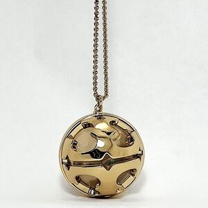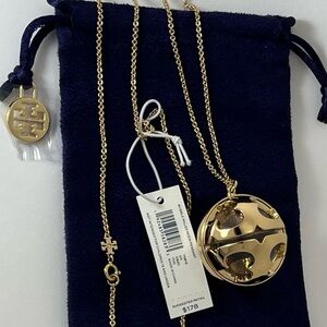The Tory Burch Miller Bubble Pendant Necklace is a distinctive accessory that showcases the brand's iconic design elements. It features a domed double-T logo pendant with cut-out detailing, suspended from a delicate chain. The necklace is crafted from 18k gold-plated brass and includes semiprecious stone accents. The chain measures approximately 32.8 inches (82.2 cm) in length, with a pendant drop of about 1.2 inches (3 cm). The necklace secures with a spring-ring closure and is nickel-free.