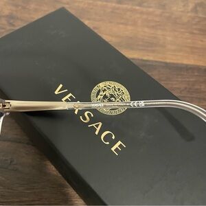 Versace face logo on front edges of frames.