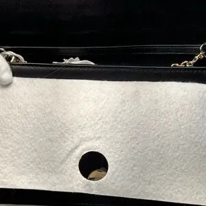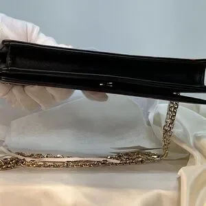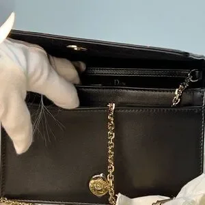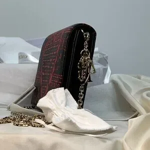 This Christian Dior LIMITED EDITION calfskin wallet on chain (WOC) sold out almost immediately in stores. This bag is in excellent unused condition with box, tag, and dustbag (“full set”). The red images on the black calfskin are crisp and the leather itself is in terrific condition with no rubbing or color loss. The bag includes gold DIOR letter charms, which can be protected between uses in a small separate dust bag. The WOC opens with a full front flap and snap closure to a front and back open compartment and a zippered compartment. The larger back compartment contains six credit card slots and is large enough to hold most cell phones. The front and zippered compartments are pristine.