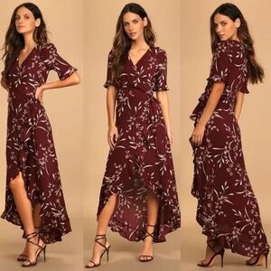 Lulus dress, burgundy floral wrap dress, ruffled high-low dress, romantic maxi dress, women's fashion