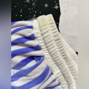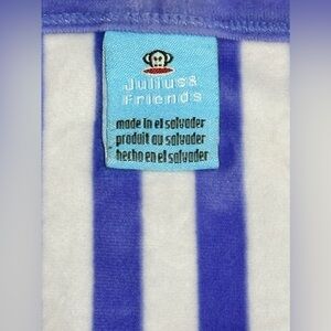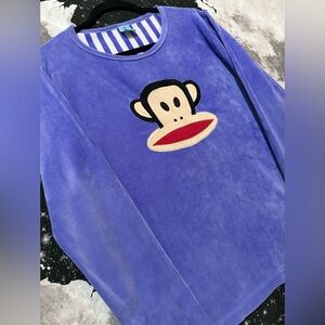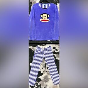 Paul Frank ‘Julius The Monkey’ super cute warm plush soft fuzzy style pajama top & bottom set, top is purple with front embroidered cartoon character design. Bottoms are striped pattern with adjustable drawstrings.