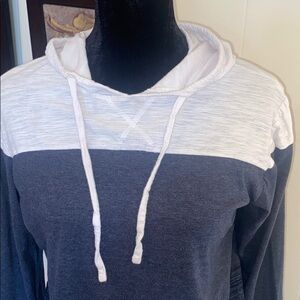 Very nice navy and white hoodie. Has kangaroo front pocket. The lower part of sleeves and shirt has lighter/dark navy striped pattern. See photos for details.