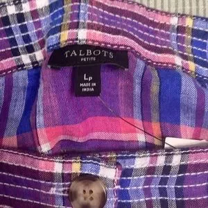 Talbots plaid linen button down top with tie at waist, square neckline. Size Petite Large. New with tags