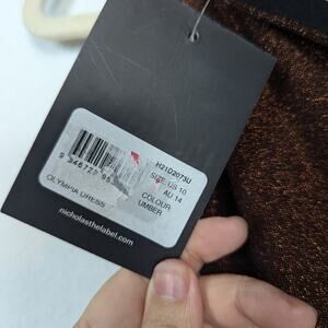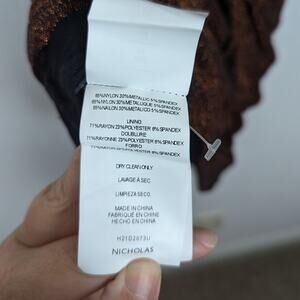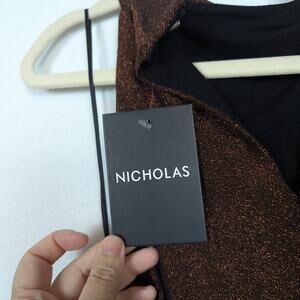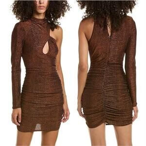 NWT Nicholas Umber Mockneck Cut Out Jersey Olympia Mini Dress. Fully lined. Hidden back zipper closure. One shoulder styling with mockneck. Delicate front cut-out. Back keyhole with loop button closure. Slinky jersey fabric with ruching and navy lurex detail throughout. Self: 65% nylon, 30% metallic, 5% spandex.