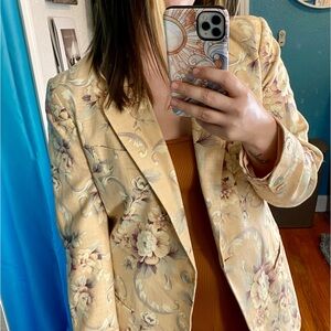 Vintage style silhouette. Fully lined. Low profile shoulder pads. Two front pockets. Single Button closure. Decorate buttons at the cuffs - One missing on left cuff. Could easily remove all cuff buttons or one from the opposite side to match. Gorgeous light pink and blue floral and filigree print throughout. No rips, holes, tears, or stains. Would recommend dry clean upon purchase.