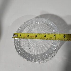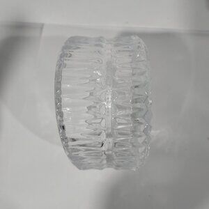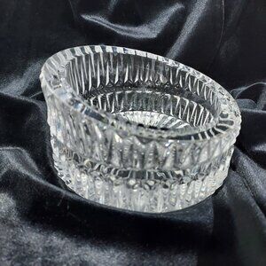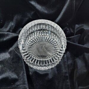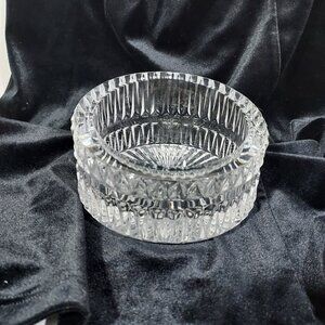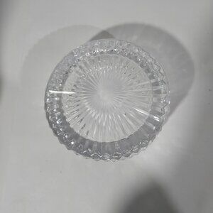 Quality crystal glass wine bottle coaster featuring a high, low-cut glass design. The coaster is made of clear glass with a stylish and sleek appearance, perfect for protecting surfaces from bottle condensation. The outside diameter is 5 1/4 inches.