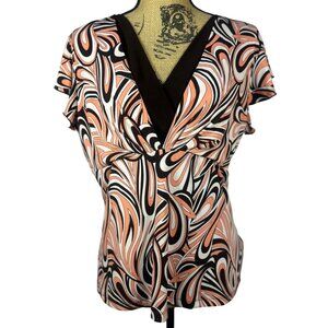Y2K Babydoll Top Sz L Retro Psychedelic Print Brown and Coral V Neck Flutter Sle
