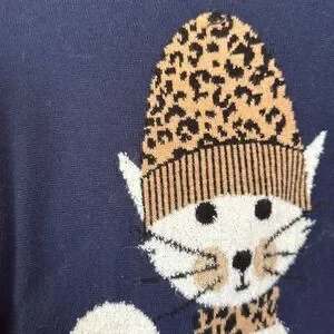 This whimsical blue sweater showcases a charming stylized cat design on the front, adding a playful touch to your outfit. The light brown and white accents of the cat figure enhance its delightful appearance, making it a perfect choice for cat enthusiasts.