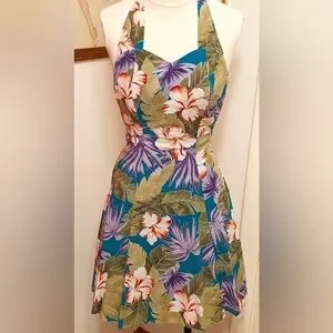 Gorgeous vintage Hilo Hattie tropical green halter flare dress. This has a stretchy part on back, offering a bit of stretch but not much, and a little bit of stretch on the halter strap.