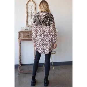 95% POLYESTER 5% SPANDEX LONG PUFF SLEEVE HOOD AZTEC AND ANIMAL LEOPARD PRINT CONTRAST BUTTON DOWN SHACKET WITH SIDE POCKET DETAIL MODEL SIZE: HEIGHT 5'8", BUST 32", WAIST 24", HIPS 36" WEARING SIZE: SMALL *The garment color may differ slightly upon arrival due to being taken with professional lighting also depending on what device you maybe using to shop*