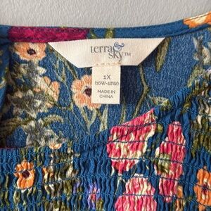 Lovely and lightweight blouse by Terra & Sky. Perfect for all occasions! Features smocked sleeve cuffs and front neckline, keyhole back, 3/4 length dolman sleeves, and beautiful floral 100% Rayon fabric. No flaws and never worn!