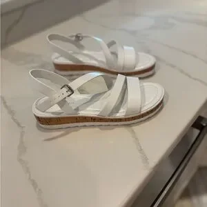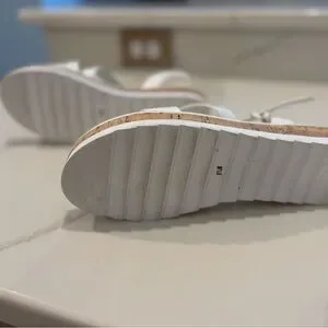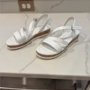 These Marc Fisher sandals feature a sleek white design with multiple thin glossy straps across the front. The open-toe style and adjustable ankle strap provide both comfort and a secure fit, while the light-colored sole offers a slight lift. Excellent condition, only worn once!