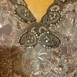 very good condition worn once evening gown from mom cheri. has been altered to be more modest so the sheet is no longer sheer on sides but looks like it can be removed if needed. gorgeous gown was about $700. there’s no tags inside alterations removed them. the sizing is a 10-12. please ask if you have any questions