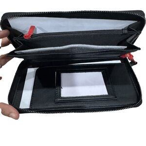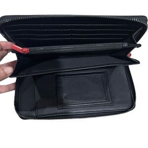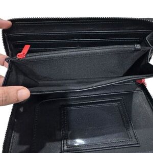 Betsey Johnson wristlet wallet in black with red hearts. Made of high-quality faux leather, this wallet is not only stylish but also durable. The zip-around closure provides a secure place to store your credit cards and other essentials.