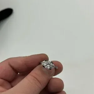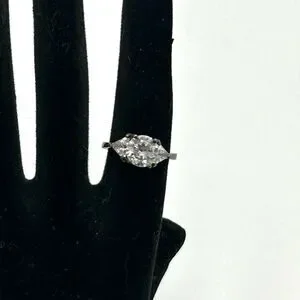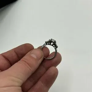 Celebrate your love story with this stunning ring, featuring a captivating oval gemstone set in a timeless three-stone design. This exquisite piece is perfect for the woman who appreciates elegance and sophistication. Whether you're planning a romantic evening or attending a special event, this ring adds a touch of brilliance to any occasion. Its versatile design ensures it can be cherished daily or reserved for life's most memorable moments. This pre-owned treasure carries a history of love and is ready to become part of your journey. .925 Sterling Silver