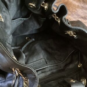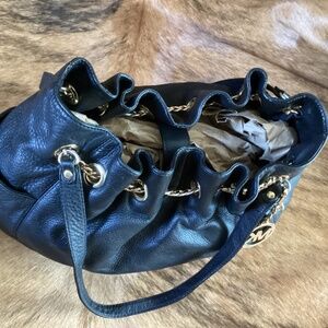 This is a beautiful black pebbled leather slouch top gather shoulder bag made by Michael Kors. Fully lined inside with zipper closure pocket and multiple slip pockets, key chain strap. Gold tone hardware with a beautiful chain accent top draw. Maker charm included. Good used condition with a few minor wear marks. Nice big deep space and very classy look.