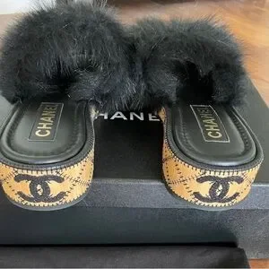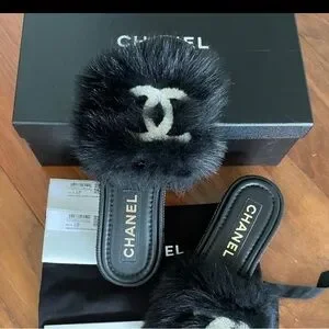Chanel CC 22B Logo Fur Shearling Slides Sandals 36.5