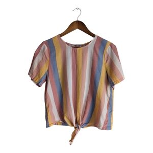 Elevate your style with this comfy sherbet striped tee from Madewell. Featuring a blend of pink, blue, and yellow, this piece adds a pop of color to any outfit. Perfect for casual outings or a day at the office.