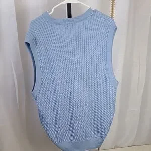 Stay stylish with this blue sleeveless sweater. Perfect for layering and adding a pop of color to your outfit.