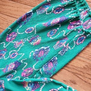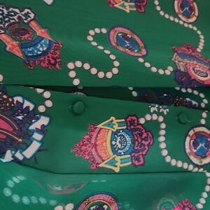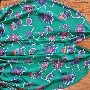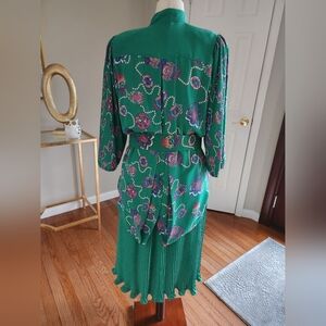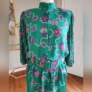 Vintage 80s Diane Freis set. Skirt is pleated with elastic waist. Solid. Flowy. Midi length. The top has Mandarin Collar, shoulder pads and full Hidden buttons front and back. Matching belt(shows some discoloration). The elastic on 3/4 sleeves have dry rot....replace or wear as is. Fun and bold pattern. No size on tag. L is my best estimate based on measurements...see pics