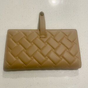 Kurt Geiger Tan Kensington Quilted Wallet in excellent condition. Tan, quilted, leather, bird head logo. Inside has lots of pockets and card slots, one zippered compartment, opens flat, snaps closed with button under bird logo. No flaws.