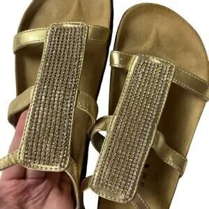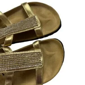 Features: sandal, gold, metallic, rhinestones, supportive footbed, Birkis, Birki gladiator vibes, ankle strap closure, buckle strap, strappy sandal, shoe, footwear, summer, beach vacation, resort, cruise, casual, dressy sandal