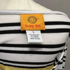 This is a Ruby Rd women's top in size Large with 3/4 sleeves. It is a striped shirt in white, pink, and yellow colors, made of cotton material. The pullover style top is suitable for casual occasions and has a basic design. It is ideal for the seasons of summer, fall, and spring.