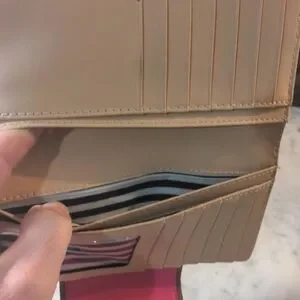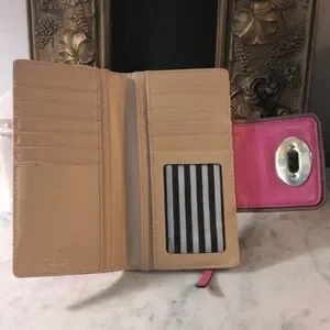 Chic and stylish, this Kate Spade pink wallet is perfect for organizing your essentials. The vibrant color adds a pop of fun to your accessories collection. Excellent pre-owned condition. I only saw one tiny pen spot on the top flap as you can tell in the photo.