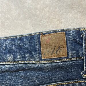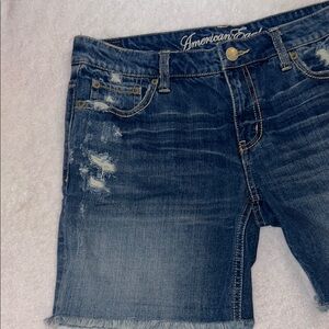 great used condition with no apparent flaws, has some distressing with the raw hem look, midrise with about 6.5in inseam, medium wash denim color, great material that is sturdy but with a bit of stretch to be comfortable