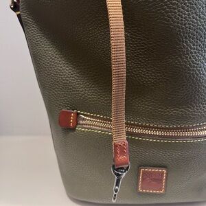 Stylish Olive leather bucket bag. Features a front zip pocket. Adjustable strap for comfort. Expected wear and tear but hardly used. Soft leather, has key strap.