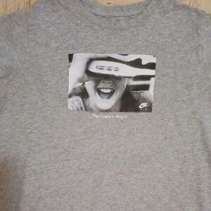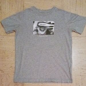 Casual gray t-shirt with a unique graphic. Features a playful design on the front. Perfect for everyday wear.