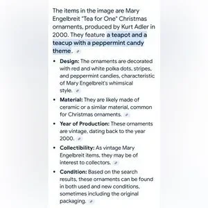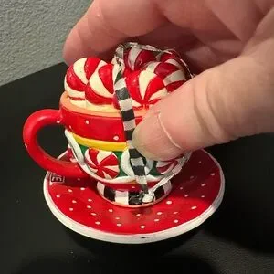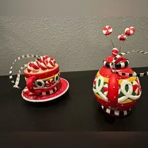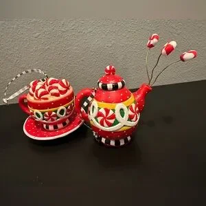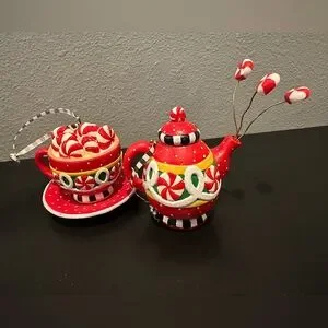 Charming tea set with peppermint design. Includes teapot and cup. Vibrant red and white colors. Perfect for festive decor. In good preowned condition. Teacup has scratches and black marks on the bottom, not visible when displayed and does not take away from the beauty and charm of the gorgeous whimsical tea set! Collectible heirloom