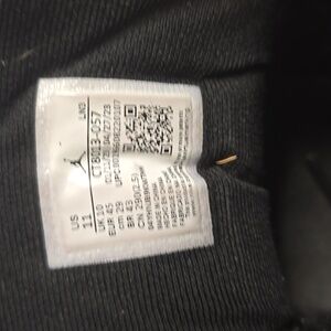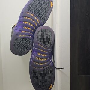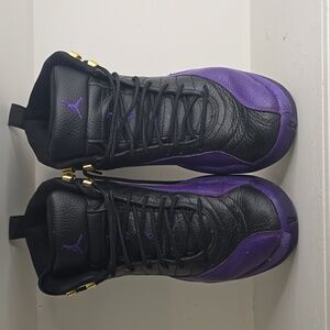 Stylish Air Jordan sneakers. Black leather with purple accents. Gold details on the sides. Perfect for casual wear. Men's Size 11. Some scuffs on heels on both shoes, as pictured. Plenty of wear still left in these. Please look at pics before purchase.