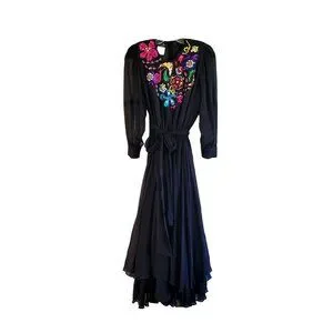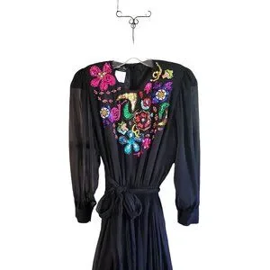 Vintage Diane Freis Original Black Silk Dress With Colorful Beaded Floral Design