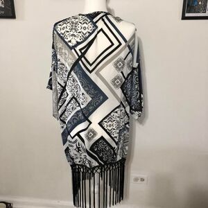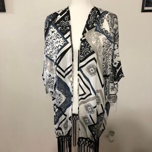 WHITE MARK FRINGE PRINT KIMONO is a trendy fringe with a variety of patterns and colors. This kimono is exactly what is needed to wear for an added pop on your going out outfit, or simply over a bathing suit.