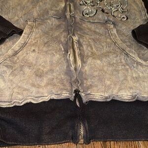 Good condition women’s Vocal full zip hoodie grayish/taupe in color w black graphics Has rhinestones on front, back and sleeves of hoodie sharp lightweight hoodie, perfect for those cool summer nites