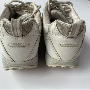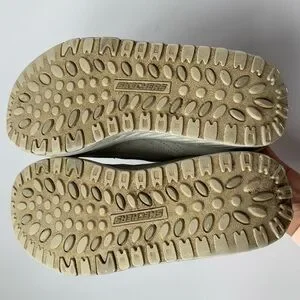100% Leather, Rubber sole. Shape Ups from Sketchers feature a super-comfy, super-thick padded midsole that's designed to cushion your every step. Boasting a combination leather and mesh upper, the Shape Ups are a breathable shoe that offers flexibility and durability for those long walks ahead. A lace up front and nylon pull loops make for easy on and off wear, and a custom fit every time. Well loved shoes and shows wear(see photos) but still comfortable and ready for some walking!