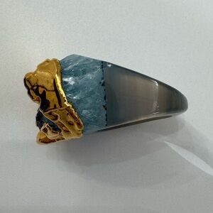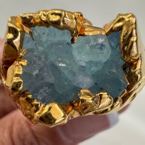 Stunning chunky blue/teal colored crystal ring is dipped in Goldtone for the ultimate fushion of natural beauty and luxury. This one is a real conversation-starter that makes a statement everytime. Size 7.