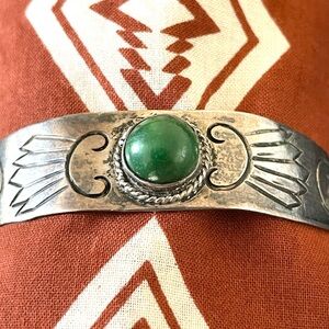 Vintage 1930s - 1940s sterling Mexico silver cuff bracelet with beautiful green stones or glass. Child size or would fit a woman with a smaller wrist. Marked “Mexico Silver”. Nice overall patina. Has some small scratches on the stones. It is 1/2” wide at widest point. It measures 4.25” from end to end measured inside, plus a 1.25” gap. Such a pretty little bracelet!