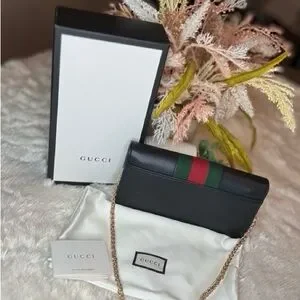 Elegant Gucci black leather bag with a stylish chain strap. Perfect for any occasion. Comes with original dust bag and box.